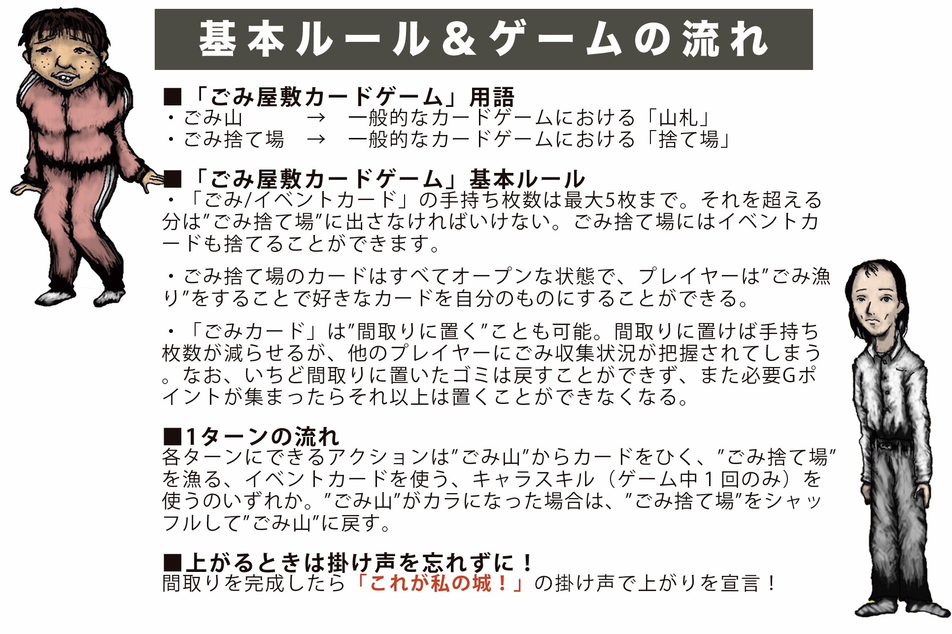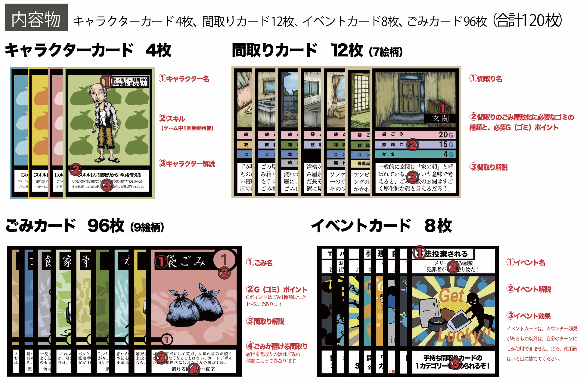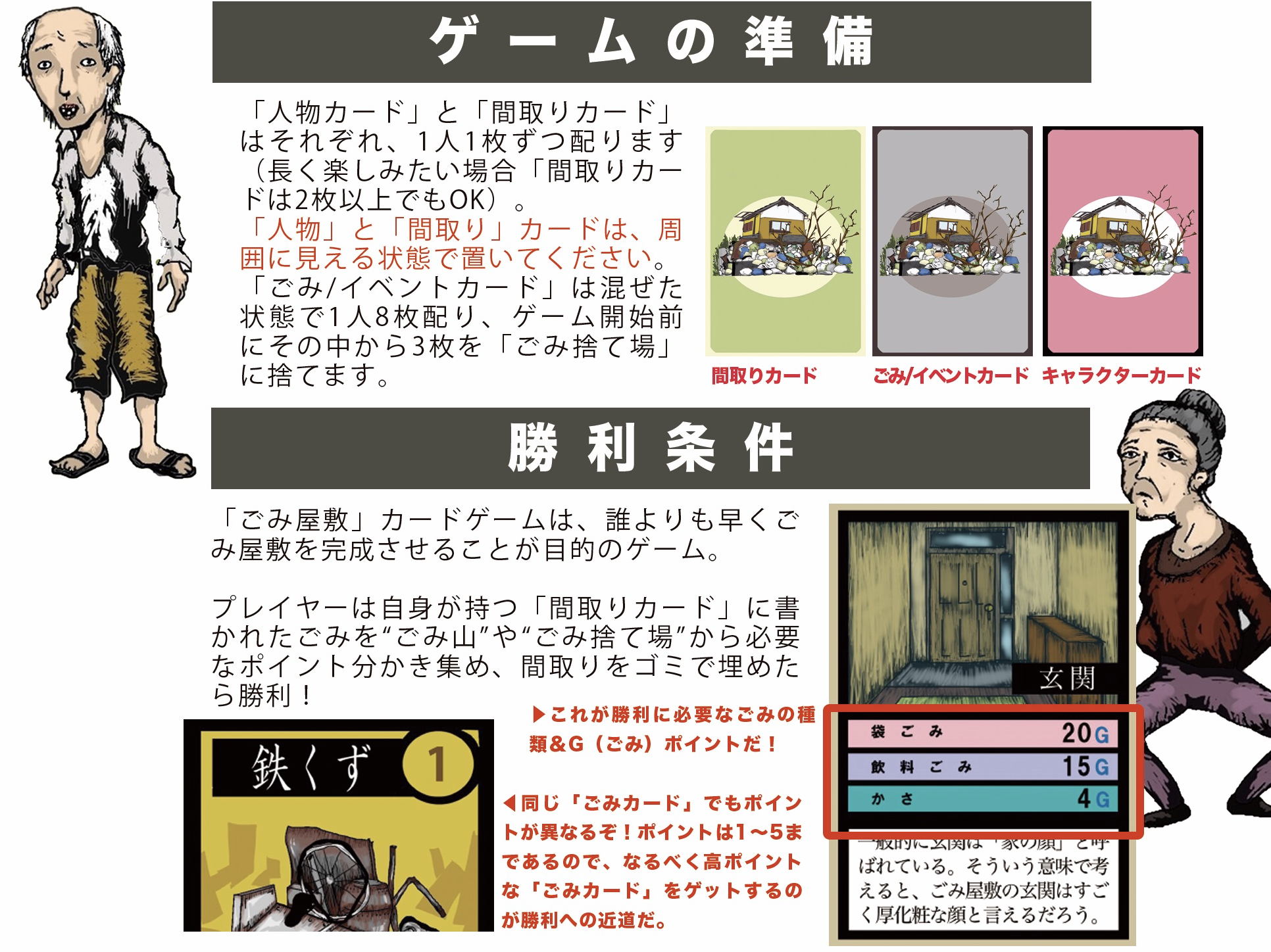 「ごみ屋敷カードゲーム」はそんな我々のみすぼらしくて薄汚れていて、でもめちゃくちゃに楽しかった青春時代の住まいをモチーフにしつつ、周囲にいた“ごみ仲間”たちにインスピレーションを得て製作したものです。