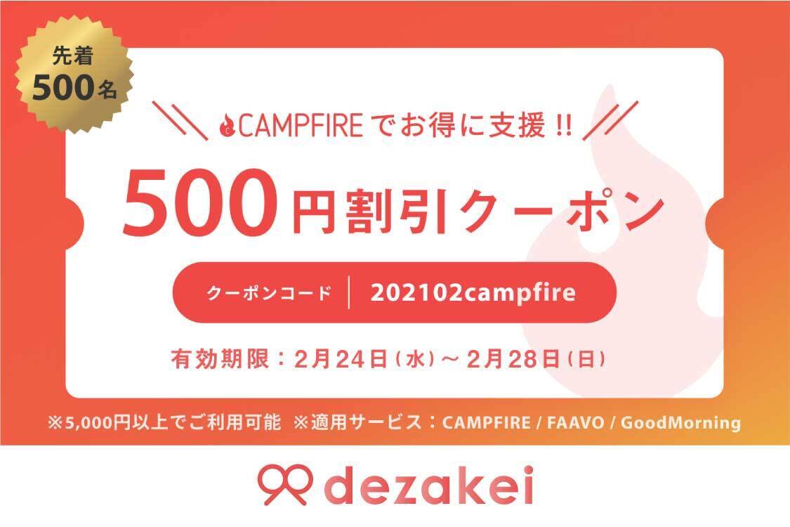 2月24日(水)〜2月28日(日)の5日間限定で、CAMPFIREで使える500円OFFクーポンを使えるので、是非ご支援をご検討していただいている方は、ご活用ください!