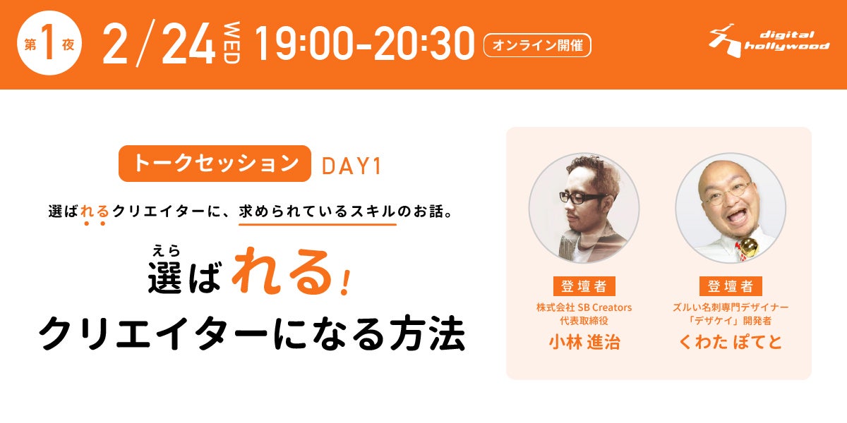 みなさん、こんにちは!くわたぽてとです!クラファン活動をしていると本当にいろいろな出会いがあり、今回はグラフィック・ウェブ・CG等を学べるデザインの専門学校「デジタルハリウッド」の主催でトークセッションを開催することが決定しました!今回は、「デザケイ」のくわたぽてとと、株式会社SB Creatorsの小林 進治さんとともに、ぼくたち目線での・「自分が仕事したいと思うのはこんなクリエイター」・「仕事相手(クリエイター)を選ぶ時に見るポイント」・「お客様から選ばれるためにぽてとがしてきたこと」などをテーマに独自の目線でお話する1時間半のトークセッション。なんと2回にわたって開催決定!!!!■こんな方にオススメ!・クリエイティブ業界に興味がある・現在Web制作やデザインなどを学んでいる・Web・デザイン制作会社に就職を考えている・フリーランスになりたいと思っている・UI/UXデザインに興味がある■イベント詳細<Day1>トークテーマ:「選ばれるクリエイターになる方法」日 程|2月24日(水)時 間|19:00-20:30参加費|無料会 場|オンライン(お申込みされた方に別途参加方法をお知らせします)※Day2は、 2021年3月16日 17:45〜を予定しています。▼お申込みはこちらhttps://school.dhw.co.jp/school/osaka/event/210224_event.html