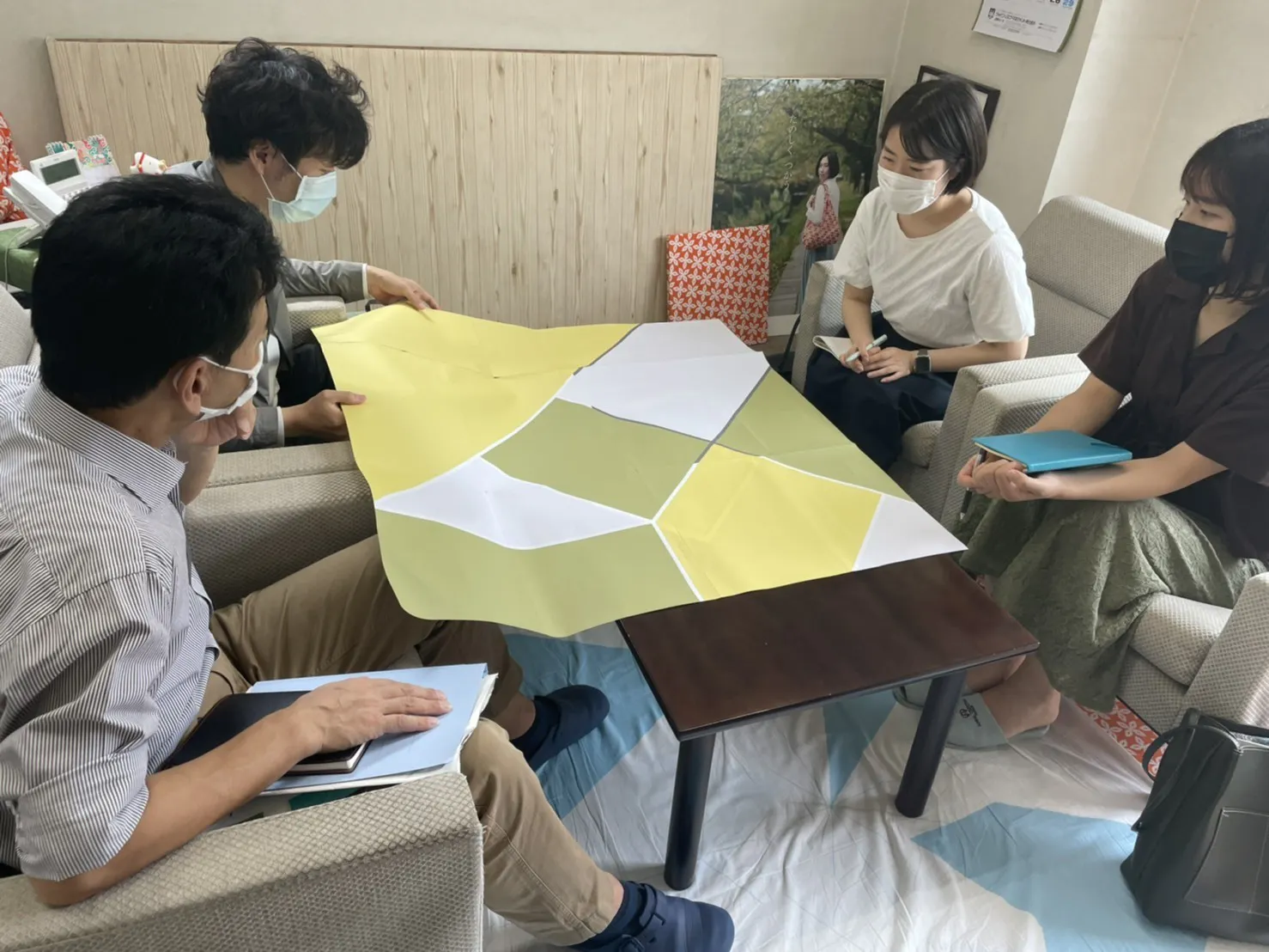 当初は、私たちがデザインや用途などを考えていましたが、物づくりをする上で、良いと思えるものを世の中に出したい!という気持ちが強かったことと、丸和商業様のご協力もあり、デザイナーの福定様とWGD京都(World Good Design 京都)の久藤様もチームとして、一緒におくるみ製作に携わって頂けることになりました。