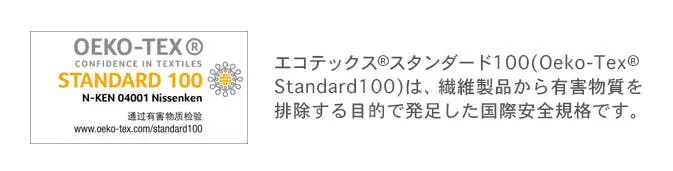 ★エコテックスは、日本の安全基準をはるかに超える、350種以上の有害物質を対象とした世界最高水 準の安全な製品の証明をはじめ、生産にたずさわる人や環境への負荷にも配慮したサステナブルな工場の認証など、繊維ビジネスにおける、世界に通ずる安全の証です。