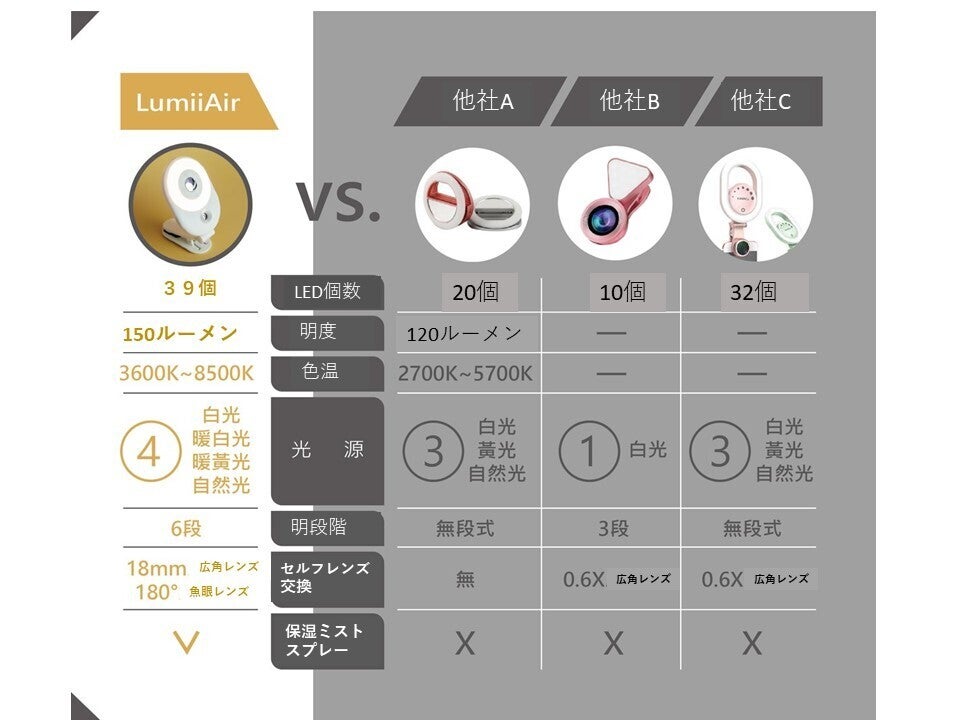 広角/魚眼レンズ(超スリム)、フィルライト(超立体的な顔の特徴を照らします)、保湿スプレー(本当に美しい肌)を組み合わせることで、いつでもどこでも美しい写真を撮ることができます!
