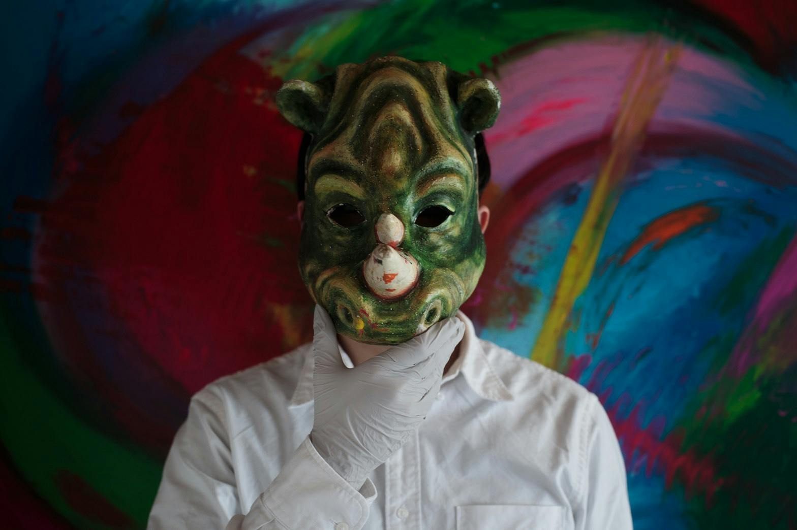 画家/パフォーマーとして福岡を中心に活動。探し絵などの遊べる絵を中心に、絵を起点としたおもしろいことを追及している。ライブペイントではデッキブラシやマグロを使い、道行く人を楽しませる。お面をかぶるスタイルで活動しており、その素顔は誰も知らない。