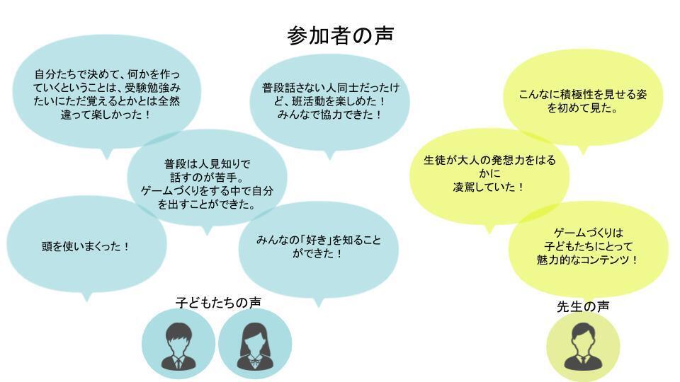 例えば、ゲームを形にしていく段階で意見が対立し膠着した時にはどのようにチームを立て直していくのか?、相手の意見と相入れないと感じたときにどのように相手の意見に耳を傾けるのか?など現実でも起きうる難しさに、現実から少し離れたゲームづくりという非日常だからこそ向き合える体験を通して学ぶことができます。