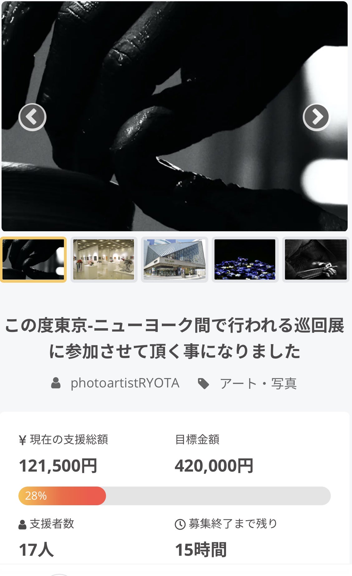 はじめまして。現在、photoartistRYOTAとして「LIFE STORY」というテーマの基、主に職人様やアーティスト様の人間の手を中心に現場で生きる人間の姿を撮影し、人間の生き様や人生を写し出す事で生きる事への希望や癒しを与えていきたいと想い創作活動を行っている者です。この度、来年東京-ニューヨーク間にて行われる巡回展に参加する為の費用をご支援頂きたくこのプロジェクトを立ち上げさせて頂きました。