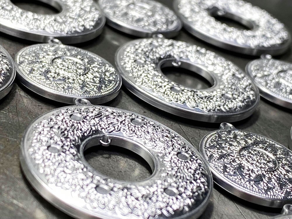 こんにちは、三代目赤坂兵之助でございます!季節もどんどんと移り変わっていく中、そろそろ世間が動き出しそうな雰囲気。リターン製作も本格化して参りました!先ずは製作の基本となってくれている、[cocur] Sora(コクール・宙):かなで、[cocur] Hana(コクール・花):ときめき、そして『曼荼羅シリーズ』の花と宙、これらが今回の皮切りとして表れてくれました。[cocur] Sora(コクール・宙):かなで、 [cocur] Hana(コクール・花):ときめき私が「美しさの基準」としているこれら『曼荼羅』のシリーズ、これらの審美性が確保されるだけの、「半月一枚刃」の切っ先や彫刻加工条件、これに先ずは成功しないと先はありません。丸くて小さく、カタチも単純、だけれどもとても繊細で精緻な彫刻...。単純なものほど「ごまかし」が利きません。食べ物で言うと「白おむすび」です。私はいつも、そのシンプルな形状を先ず成功させ、それら成功の条件や内容、気付き、ひらめきを反芻しながら新しいデザインを考えるようにしています。以前にも書いたかもしれないのですが、まず最初に「頭の中での実彫刻加工」をイメージして、それが成功してからでないと段取りをしません。それが「成功」してから、実際の素材を手にとって、あちこちから眺めては、「この辺りにあのカタチが埋まっているから...」と、頭の中で実彫刻加工を想像し続けます。そのようにして、皆さまにお届け致します『赤坂式半月彫刻法』での作品たちは、「その素材から取り出されて」いきます...。ジュラルミンに「半月一枚刃」で曼荼羅の美しく繊細な世界を彫刻しております。それはまるで、嬉しい気持ちで夢中になって、いつしか撮りすぎていたポラロイドから、一番に気に入った一枚を探し出すかのような...。私の作品を気に入ってくださった、そんな皆さまへの「一枚」になれますように、今日もがんばって研ぎ澄まさせ続けております。赤坂金型彫刻所代表 三代目赤坂兵之助