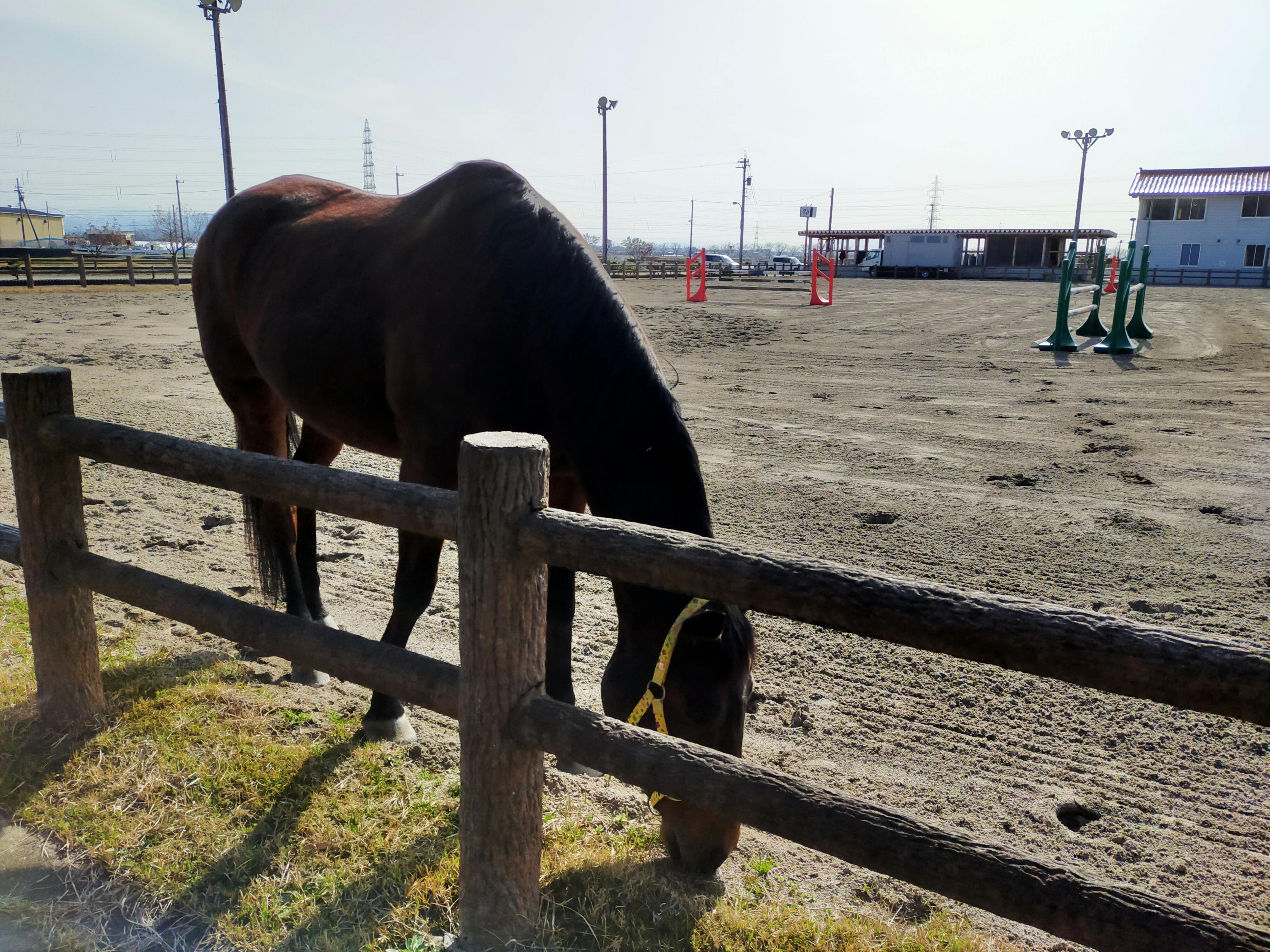 神社のすぐ側にお馬さんの小屋があったので、こんな近くで馬をみることができるのですっ。