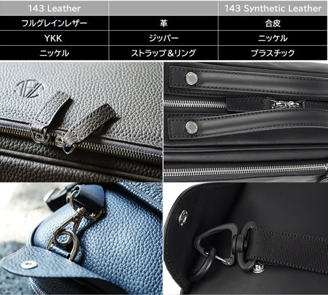 143 THREE IN ONE BAGは高品質なフルグレインレザーとよりお求めやすい価格の合皮の2パターンをご用意しています。