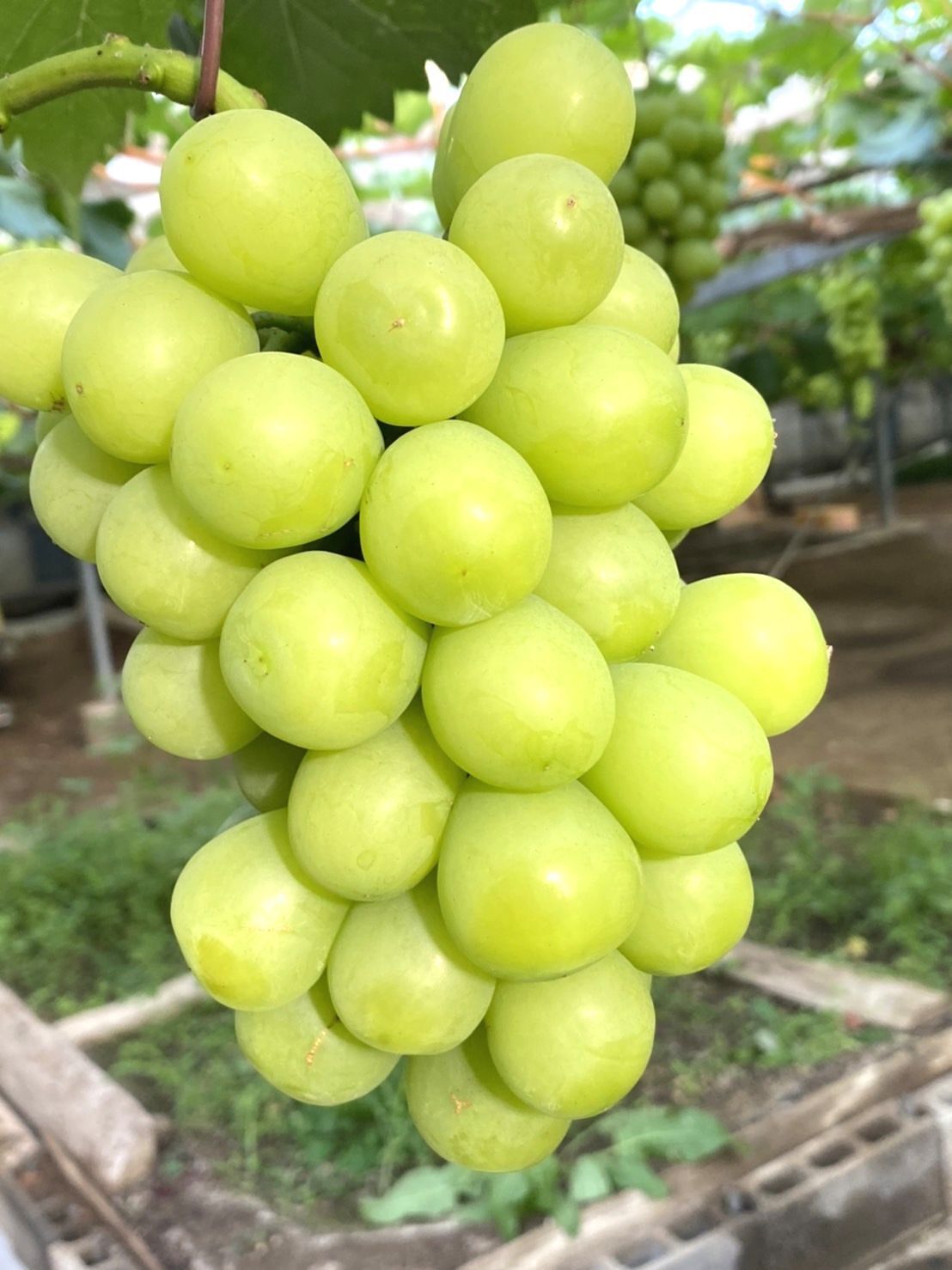 シャインマスカットの血を引くこれから期待のぶどうです。大粒で、皮は薄く糖度はシャインマスカットぐらいあります。岡山県内でも栽培数が少ないぶどうです。