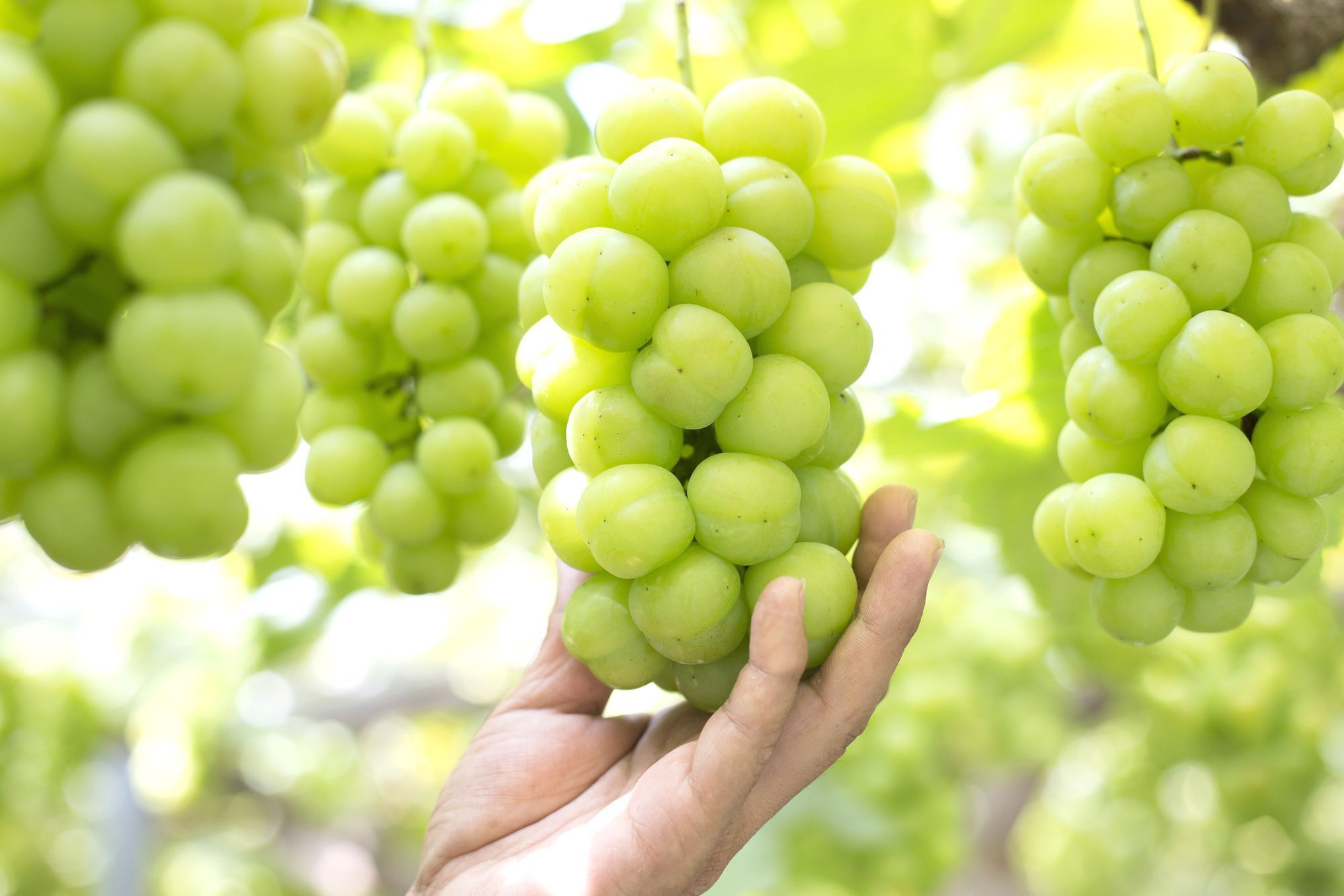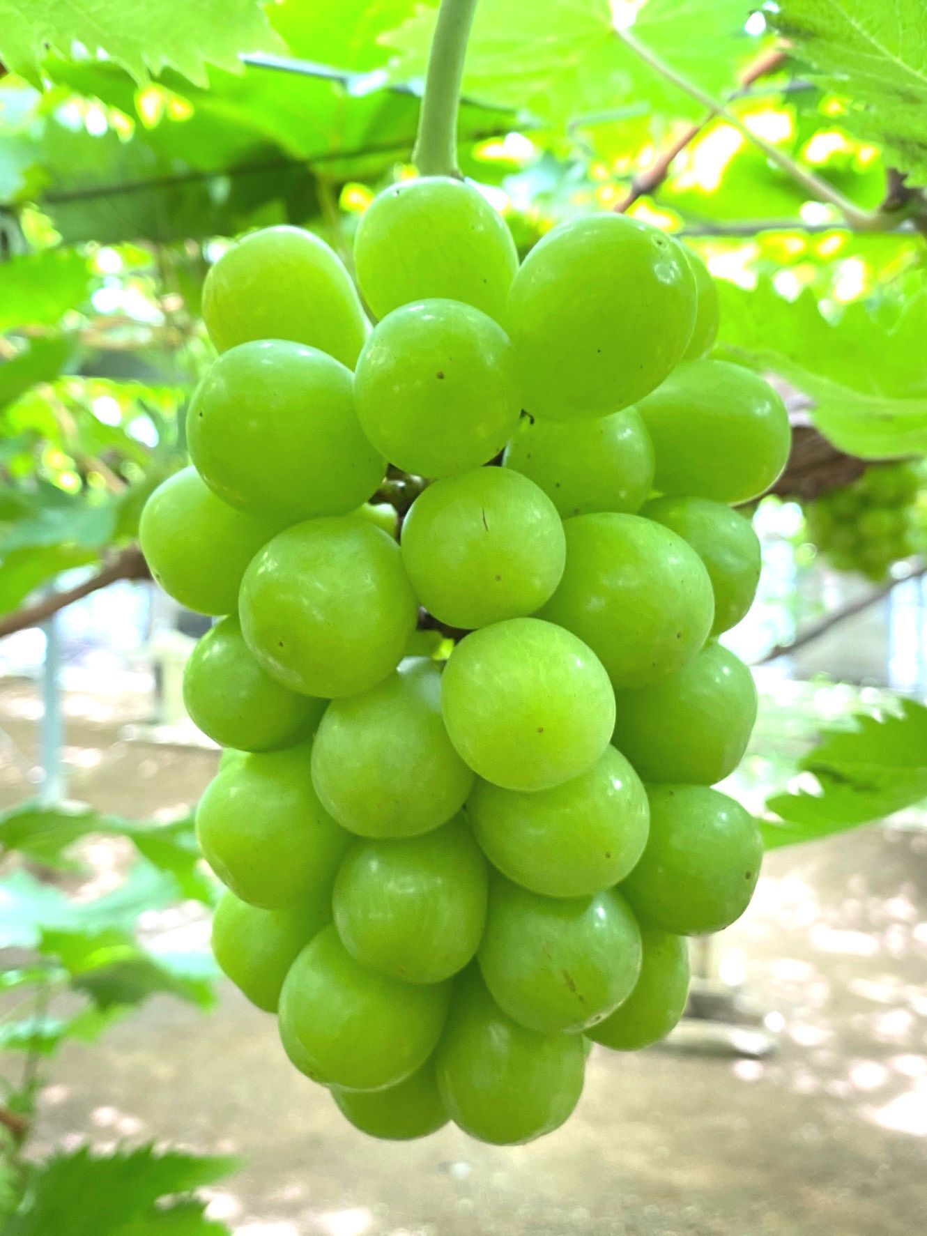 「マスカット・オブ・アレキサンドリア」に、病気に強い品種を掛け合わせ、さらにさわやかな香りの品種を掛け合わせて日本で生まれた種なしの品種です。粒はやや楕円形で黄緑色の形をしており、パリッとした食感の皮ごと食べられる手軽さと強い甘さで人気が高いです。雨に非常に弱く、苗木を植えて実がなるまで3年はかかるため、当園でも、わが子のように手塩にかけて育てています。