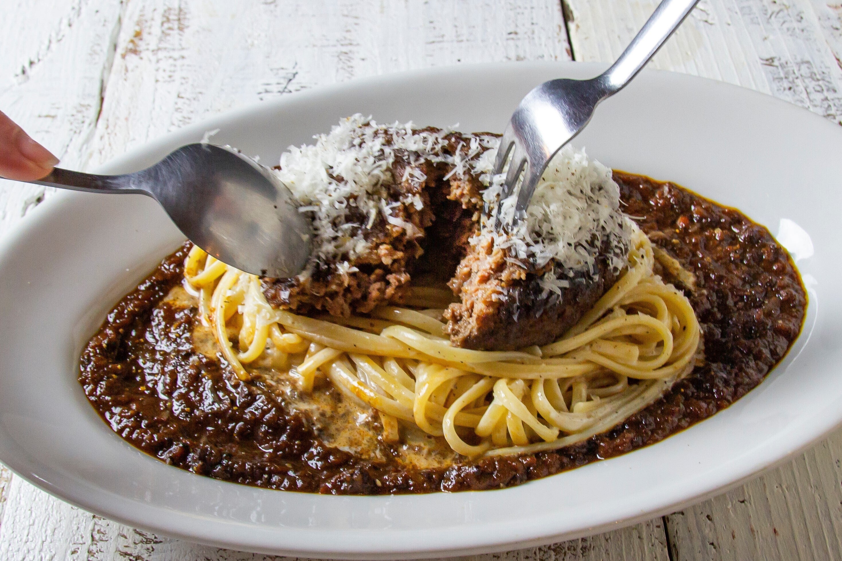 黒毛和牛だからできる、変な牛の臭みがせず、ゴロゴロの超あらびきのハンバーグが肉肉しさを感じさせる。肉ボロネーゼをご堪能下さい。