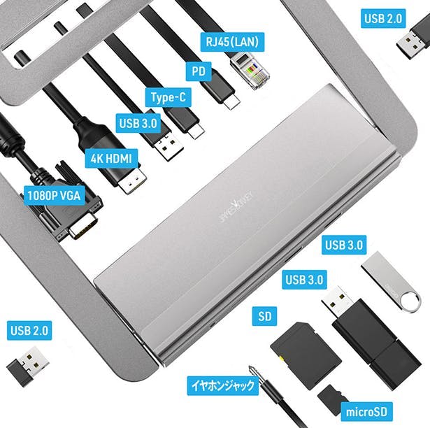 この【ドッキングスタンド】は高速データ通信対応のUSB3.0をはじめSDスロット、PD、4K HDMI 、1080P VGAなど各種デバイスで使われる13個のコネクタを一堂に搭載。