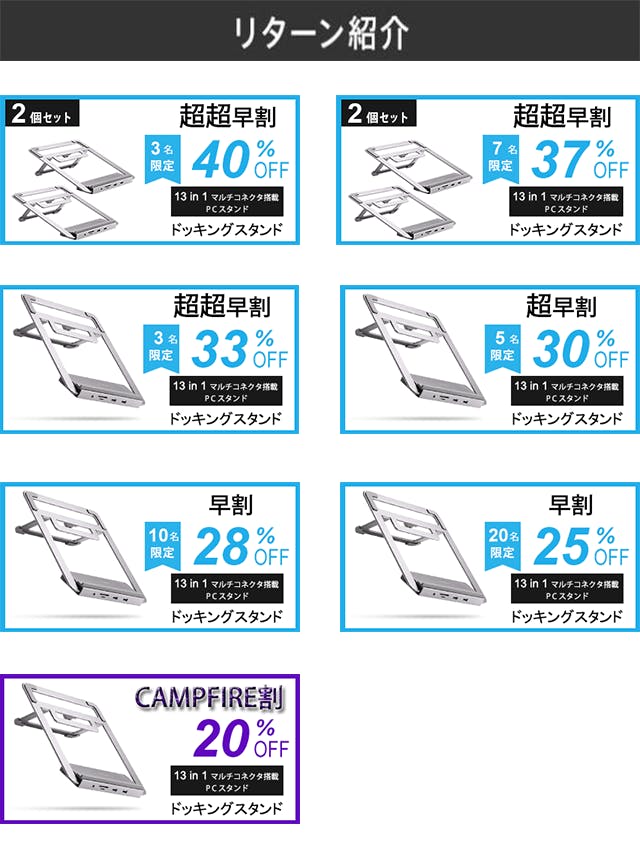 今回、日本において「CAMPFIRE」でこの”ドッキングスタンド”が販売できる機会を楽しみにしています。