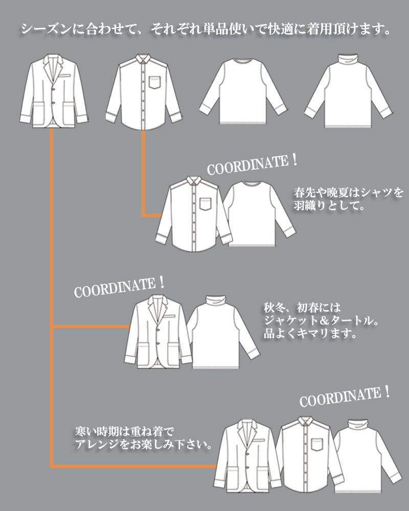 ノンストレスでキマる男前ウェアが完成しました。この心地よさは着たまま熟睡出来てしまう程。今回はジャケット・シャツ・ロンT・タートルの4アイテムをご用意。全てハンサムシルエット仕様です。