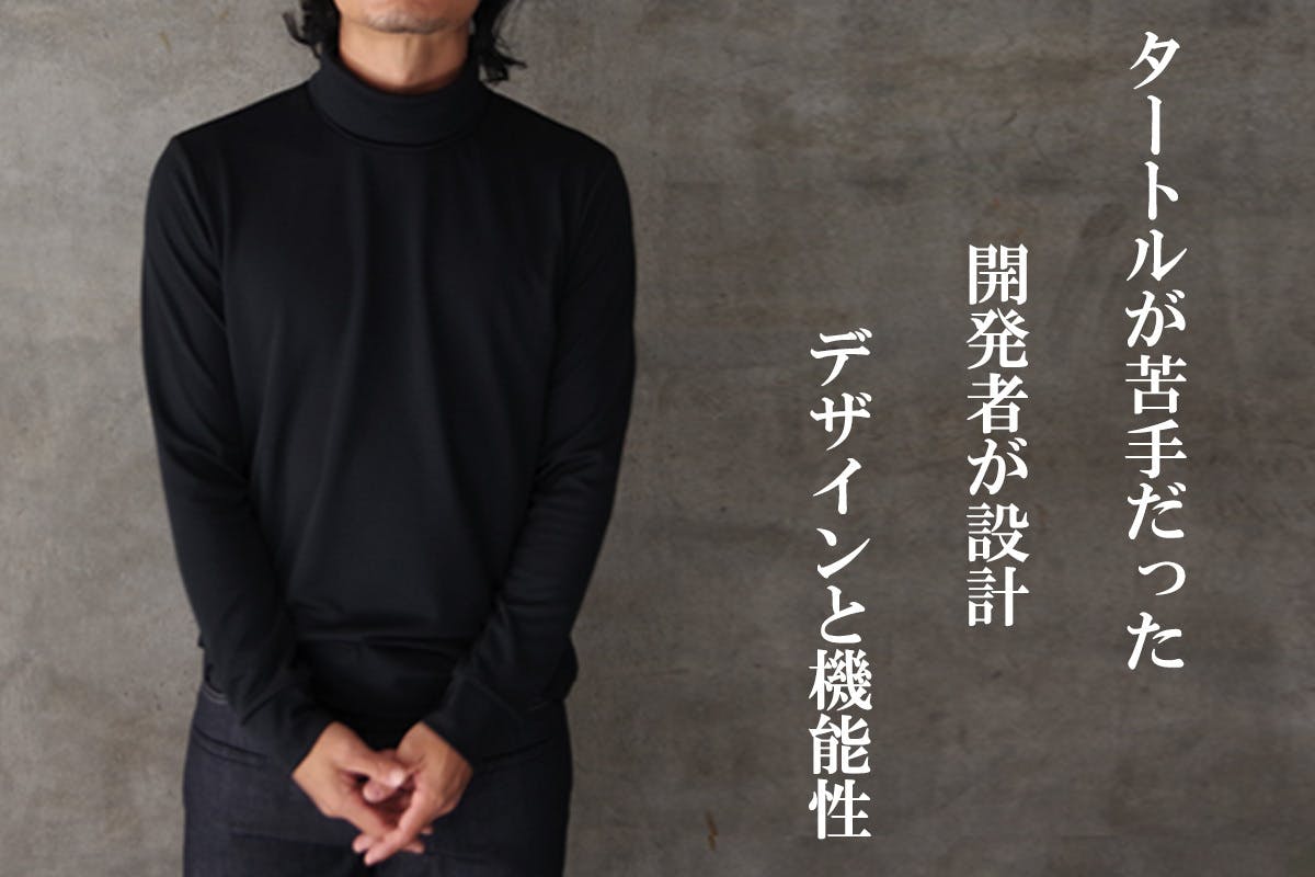 タートルネックが苦手だった、開発者が設計したタートルネックです。”首周りの締めつけ”、”チクチクとした肌当たり”、”蒸れや熱こもりによる不快感”。着用時に発生するこれらの問題を”ゆとりの衿ぐり設計”、”肌当たりが良く蒸れを抑える調温湿素材”で解消しています。