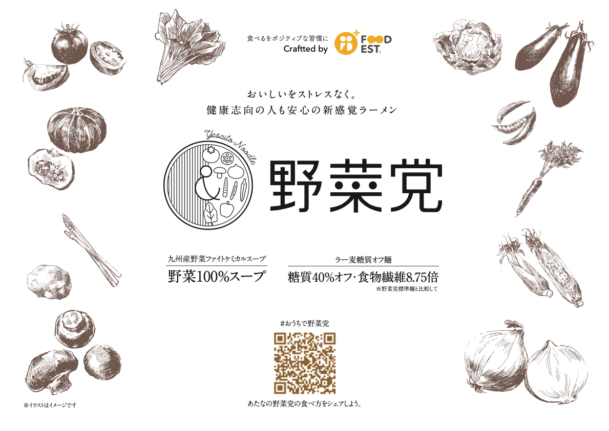 「ラーメンは好きだし、食べたい。でも身体の健康が気になる…」という方が、毎日食べても体に負担が少ない健康志向のラーメンを創りたいという想いから、野菜だけで出汁を抽出したスープの開発を行い、毎日食べて健康になれる美味しいラーメンを合言葉に『野菜党』が誕生しました。