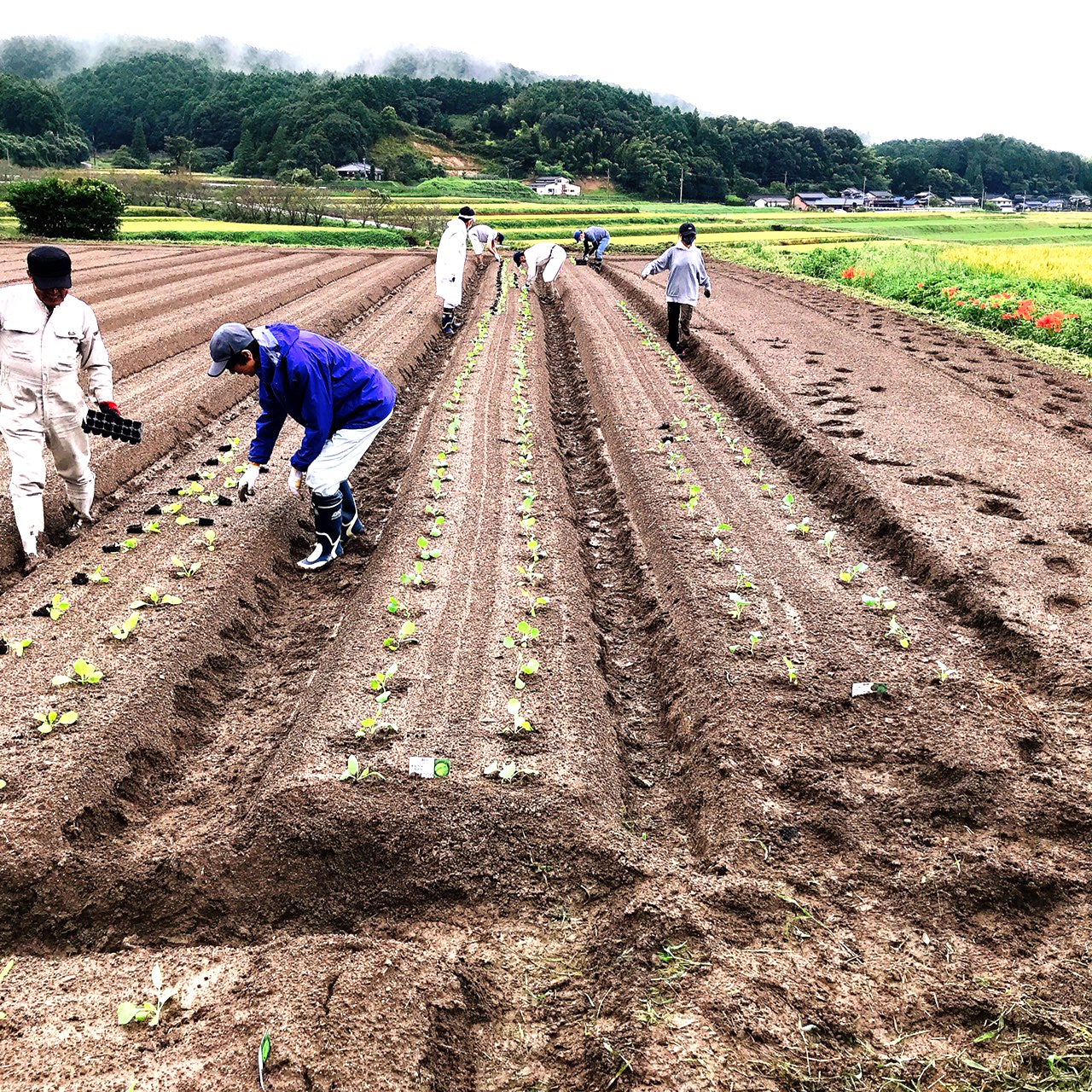 畑での苗植え作業