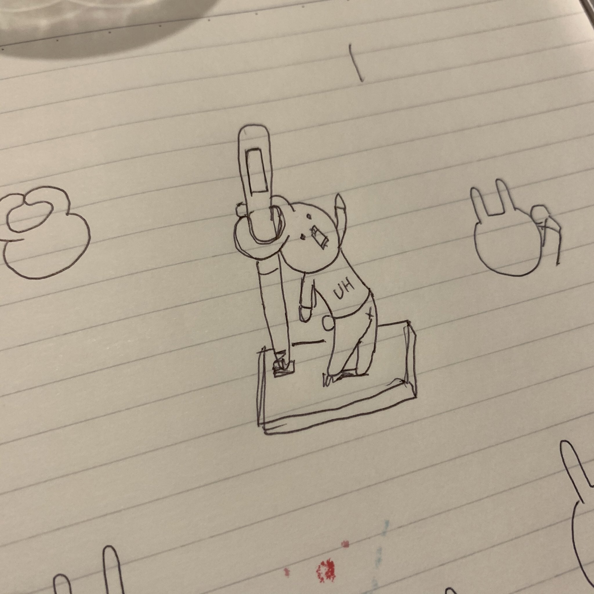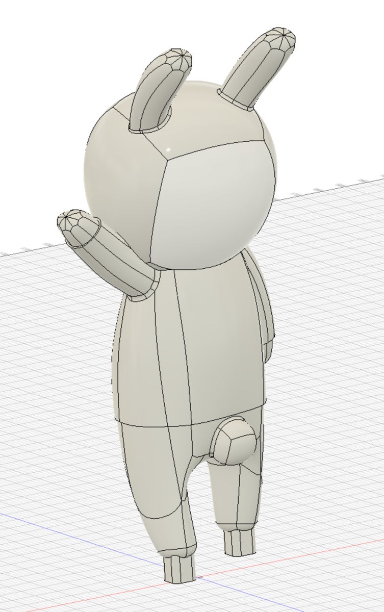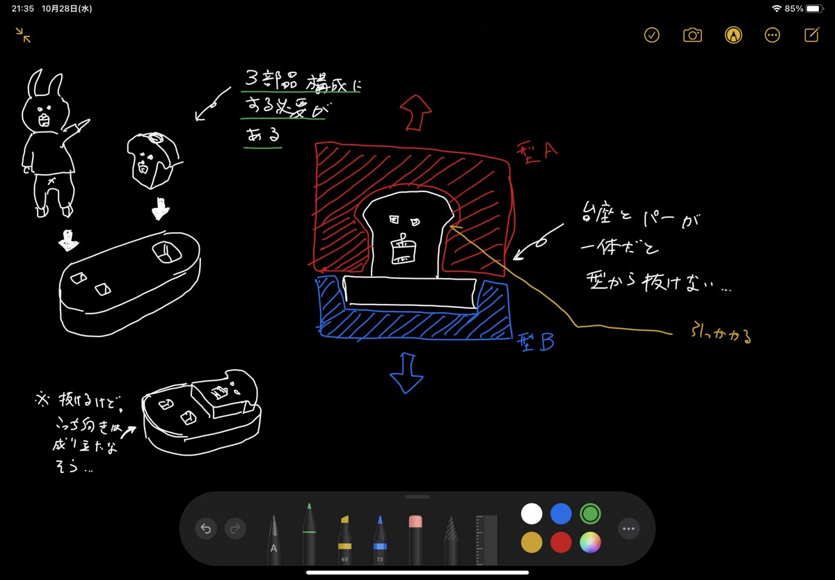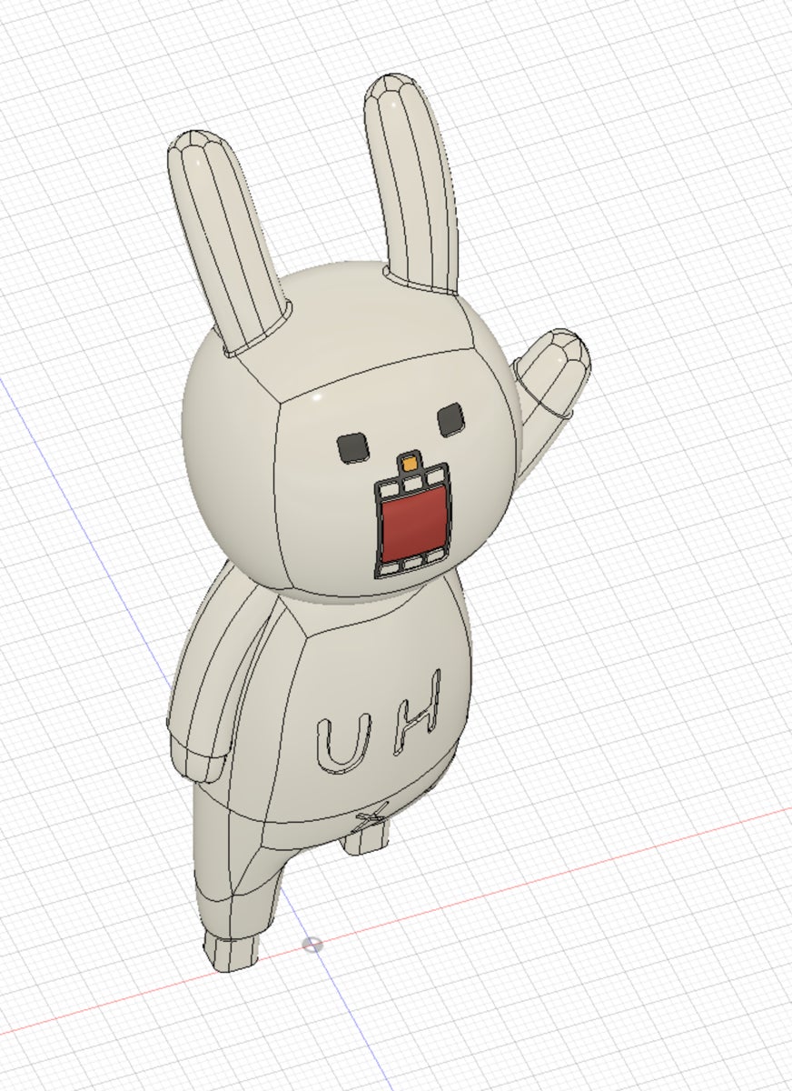 立体に起こすとスケッチ段階で見えていなかった課題が見えてくるので、ひとつひとつ解決していきます。初期スケッチのように耳をクワガタの形ようにしなくても、台座の工夫で体温計を置いたときの安定感を保てることがわかったので耳はなるべくいつものウーの形にすることにしました。