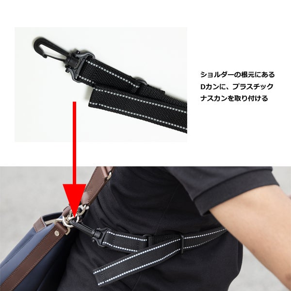 クロスストラップのプラスチックナスカンを、お手持ちの鞄のD字型金具に取り付けて下さい。