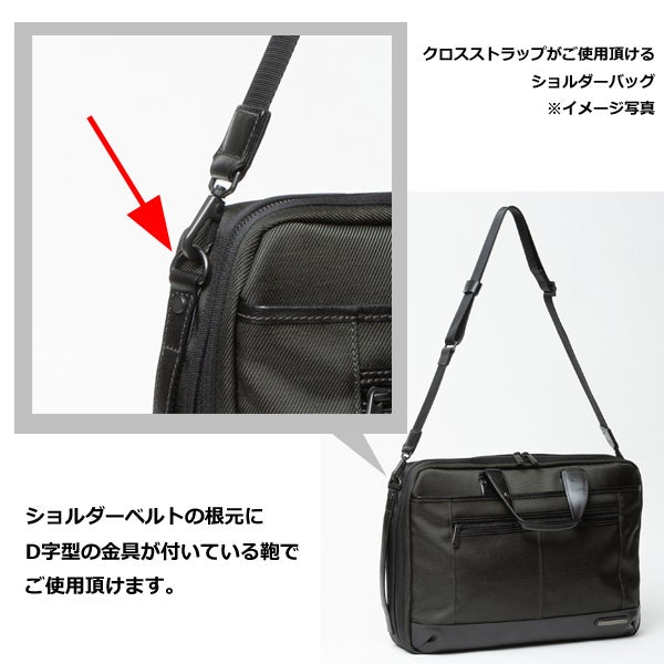 クロスストラップは、上記の写真のようにショルダーストラップをD字型の金具で止めている構造の鞄に対応しております。ショルダーの根元にD字型の金具が付いていない鞄ではご使用頂けませんのでご注意下さい。