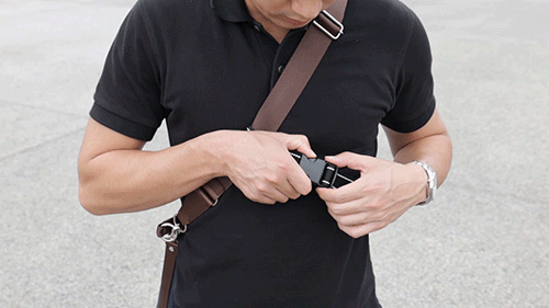 クロスストラップは、既存のショルダーベルトに補助として取り付ける事により、鞄を3点止めにして、ズレ落ちを防止する構造になっています。