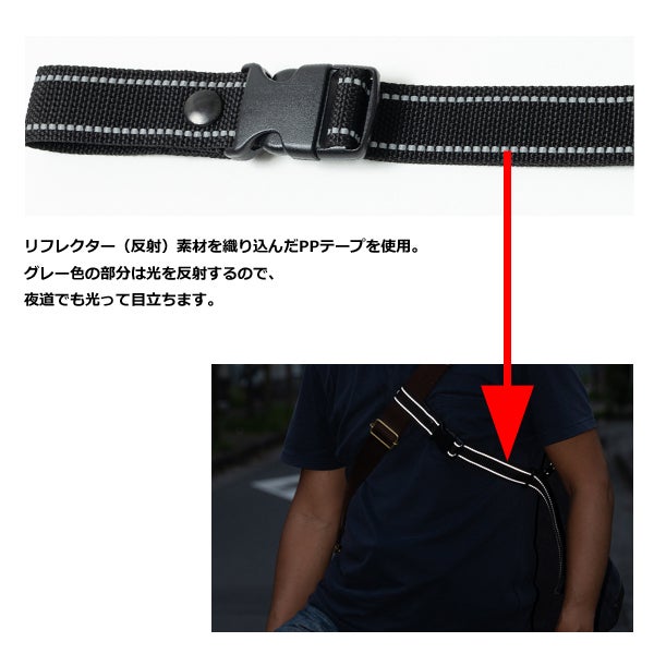 テープは、リフレクター(反射)素材を織り込んだPPテープを使用しています。