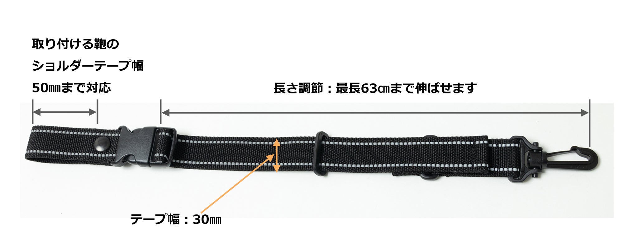 サイズ:長さ最長63㎝まで対応、取り付ける鞄のテープ幅50㎜まで対応