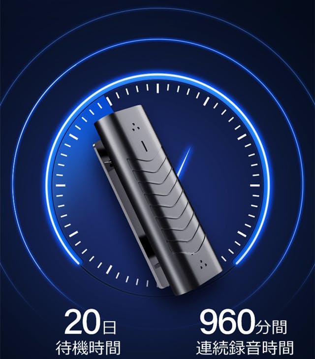 充電式の450mAhバッテリーを搭載しており、フル充電なら20日間待機、最大960分間の連続録音時間ができます。