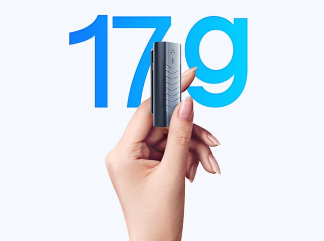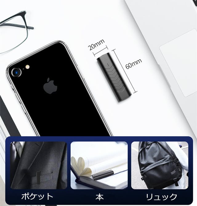 超小型のサイズ(60x20x12mm)かつ超軽量(17g)で、胸ポケットや鞄などに入れることができ、持ち運びにとても便利です。背面にクリップがあり、胸ポケットで留めることもできます。
