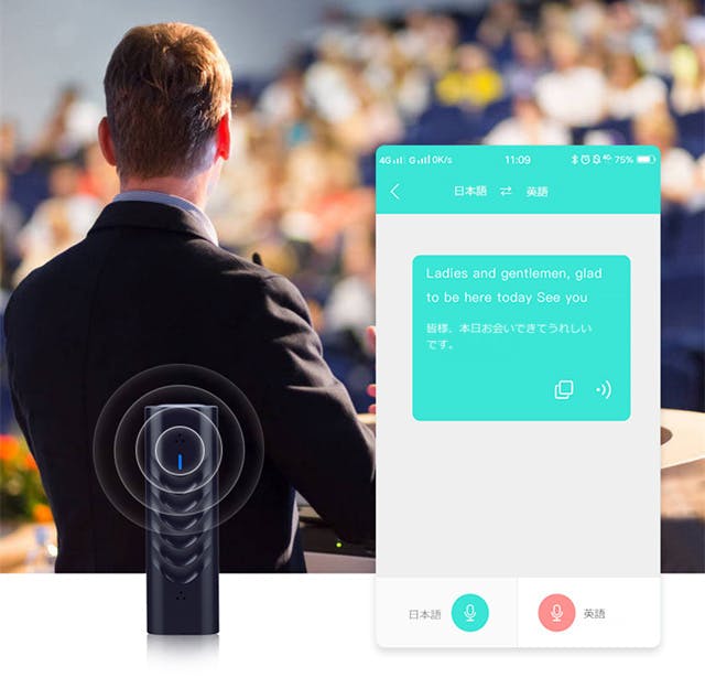 翻訳機としてご利用いただけます。アプリAI OFFICEと連動し、録音翻訳、瞬時翻訳などができます。