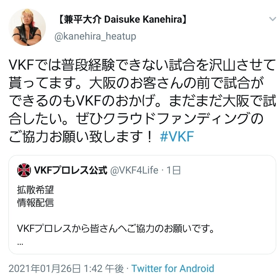 VKFプロレス クラウドファンディングVKFプロレス2021年大会開催継続プロジェクトにご支援頂き誠のありがとうございました。結果です836,500円(目標金額5,000,000円)目標達成率 16%支援者112人正直、思っていた以上の”挑戦”惨敗ですねこの結果を心身に受け止めたいと思います。しかし、このプロジェクト通じて“VKFプロレス”を世間に知って頂く事が出来、プロジェクト挑戦して良かったと思います。そして何と言ってもこのコロナ渦で皆さまも何かと苦しい中プロジェクトにご支援頂いた皆さんには心から御礼申し上げます。また、ご支援と同時に心温まる激励のメッセージありがとうございました。すべてのコメント読ませて頂いてます。お一人お一人のVKFプロレスへの愛情と感謝します。そして、このプロジェクトの告知・情報配信・拡散にご協力頂いた皆様、誠にありがとうございました。リターンに関しまして予定通り3月から順次発送させて頂きます。また、日程調整が必要な支援者さまにはメールなどでご連絡させて頂きます。団体の存続に関しましていろいろ厳しい状況ですがVKFプロレスのブランドを残させてくださいこんな状況下でもプロレスで勇気と元気を世界発信します‼VKFプロレスが贈る最強最高バトルエンターテイメントにご期待ください!最後になりますが皆様には必ず「支援して良かった・協力して良かった」と思える"最高のプロレス"を提供しますので今後もVKFプロレスを宜しくお願い致します。株式会社VKFエンターテイメント/VKFプロレス 川村俊之