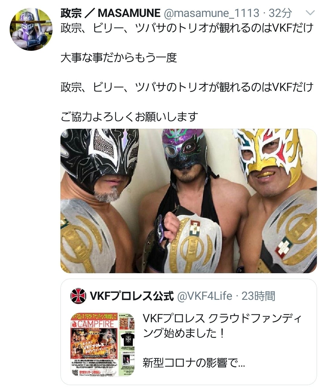 VKFプロレス参戦選手からの応援メッセージ 政宗編ビバメヒコカブロネスUWA世界6人タッグ王者(政宗&ビリーケンキッド&ツバサ)
