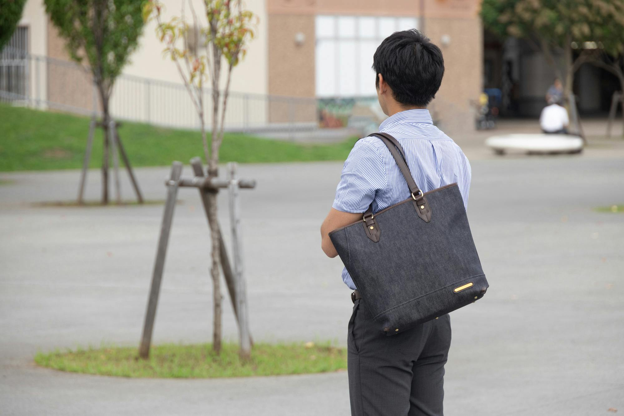野崎製作所ではこちらの「横幅スッキリひざ上サイズ!多機能デニムトートバッグ」ブラウンを展示致します。