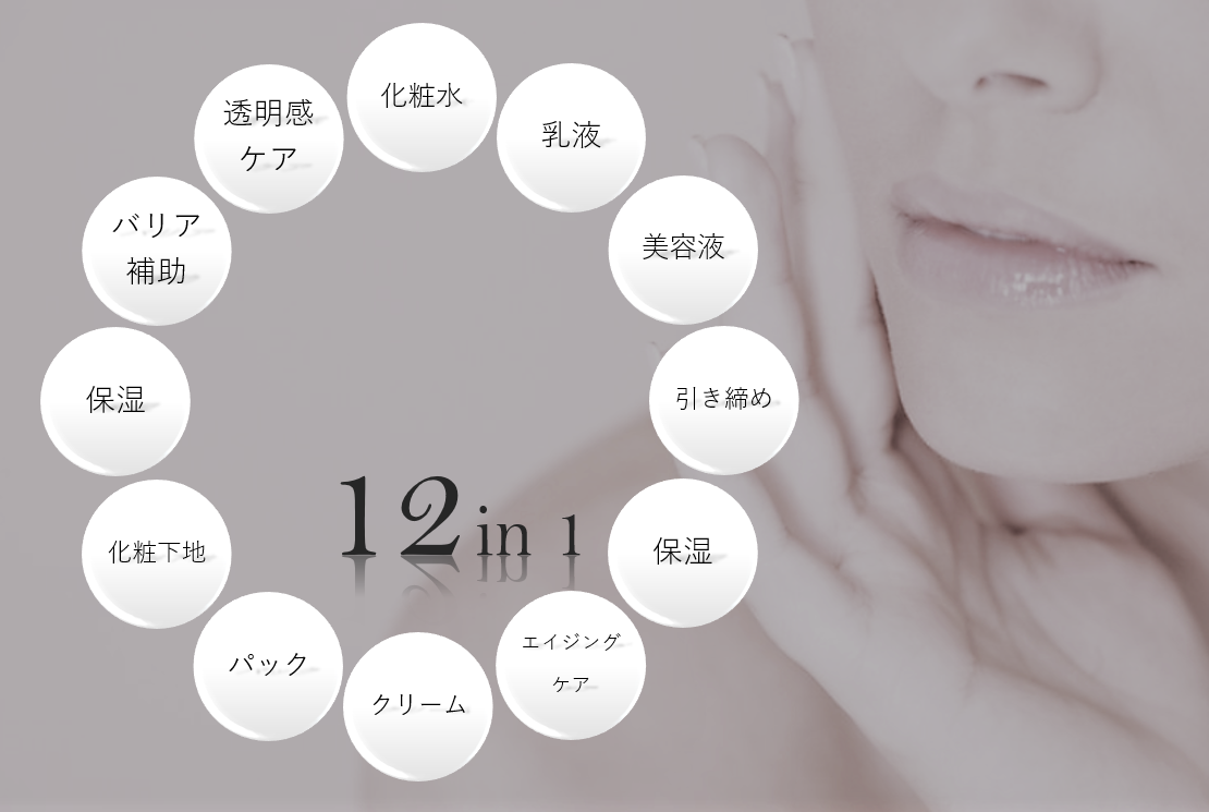 水性エッセンスにおいて美容成分は表皮の油脂膜によってはじかれます。そこで、有効に皮膚に浸透させるため、乳液の持つソフトな乳化作用により、成分が表皮深部へ作用します。