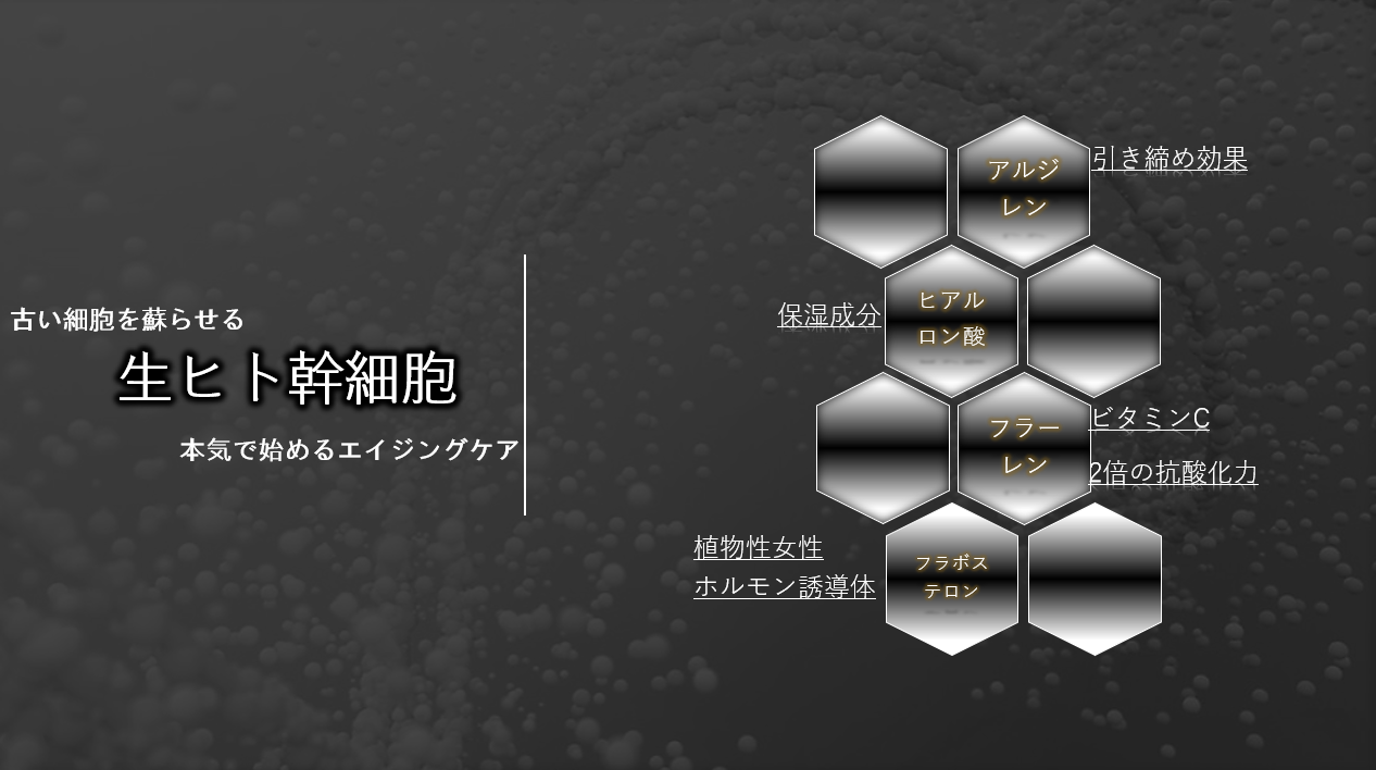 成分:ヒト幹細胞/活性型FGF/EGF/ナノカプセル化コラーゲン/フラーレン/アルジレリン/リビジュア/ピクノジェノール/フラボステロン/ヒアルロン酸/SOD/グリチルリチン/アラントイン