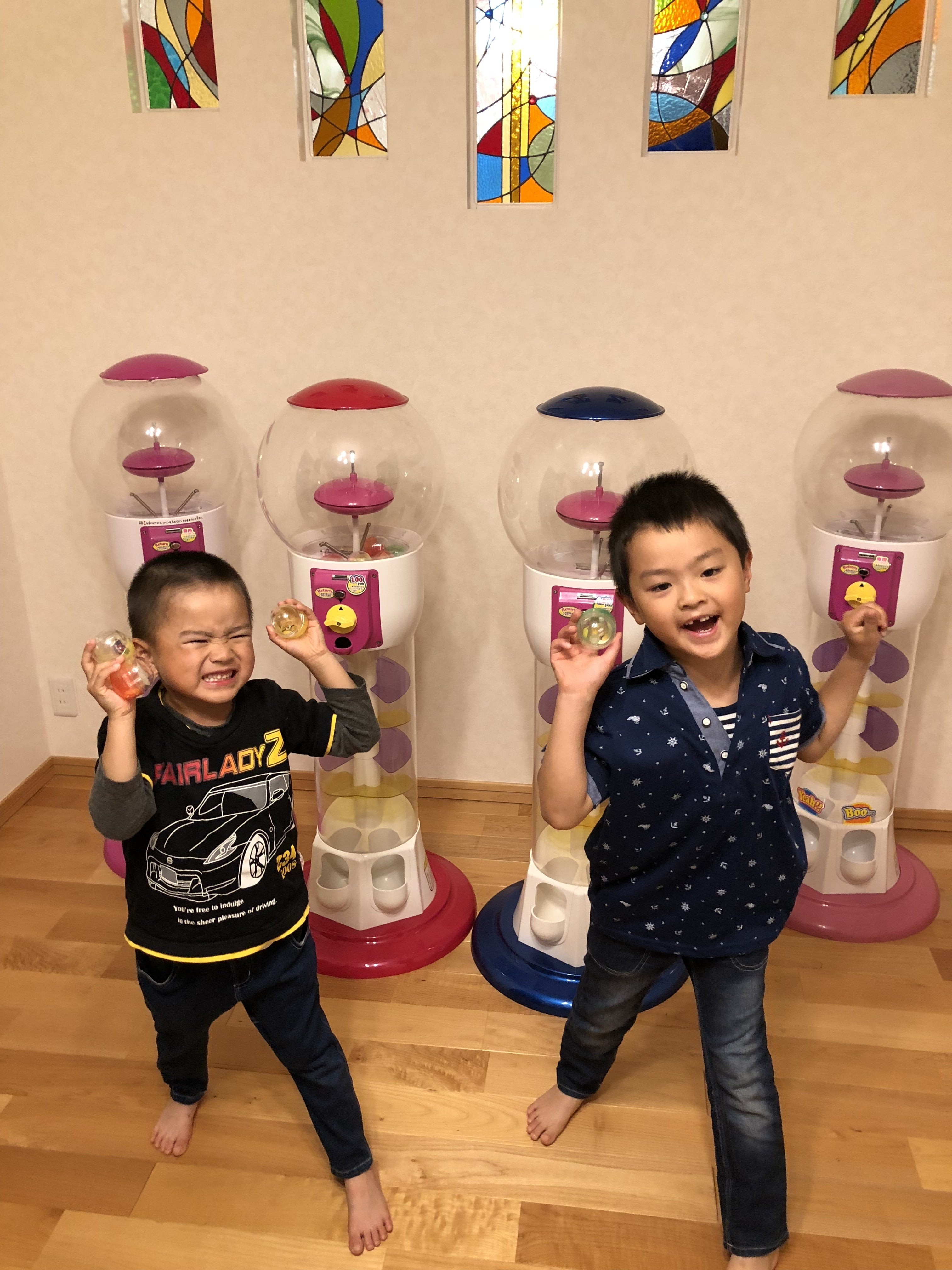 ガチャガチャの景品が出て喜ぶ子供たち