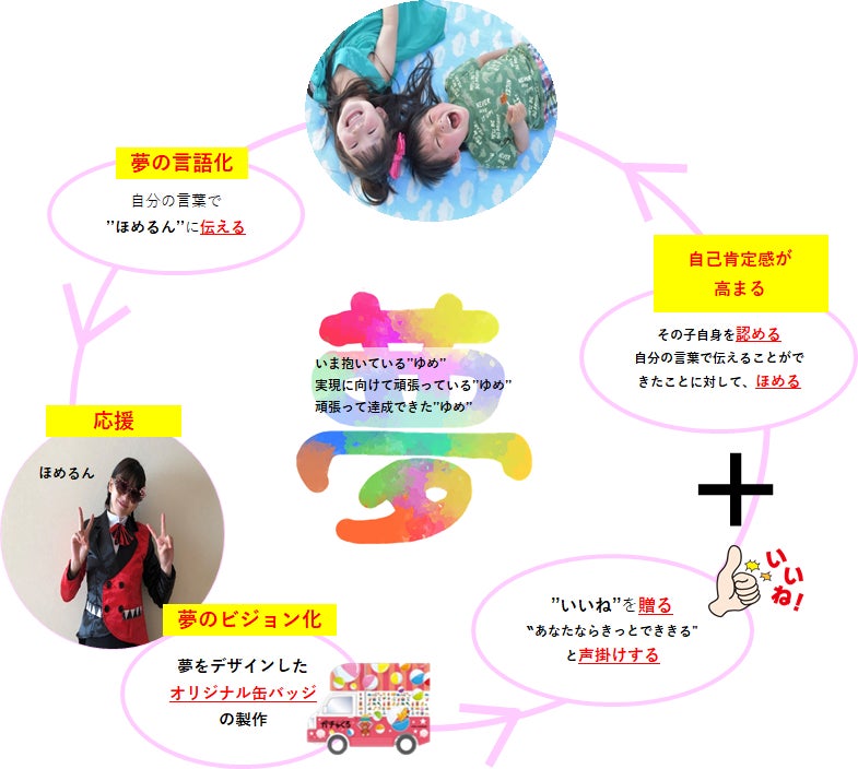 そこで、『ほめるん』というキャラクターが、子供たちが夢に向かって挑戦したことに対してその過程をほめる!達成できた嬉しい気持ちを一緒に喜ぶ!そして、子供たちの想いに対して、「いいね!」「あなたならきっとできる!」と声かけをしていき、子供たちが自分に自信をもって輝ける世の中を作っていきたいと考えています。