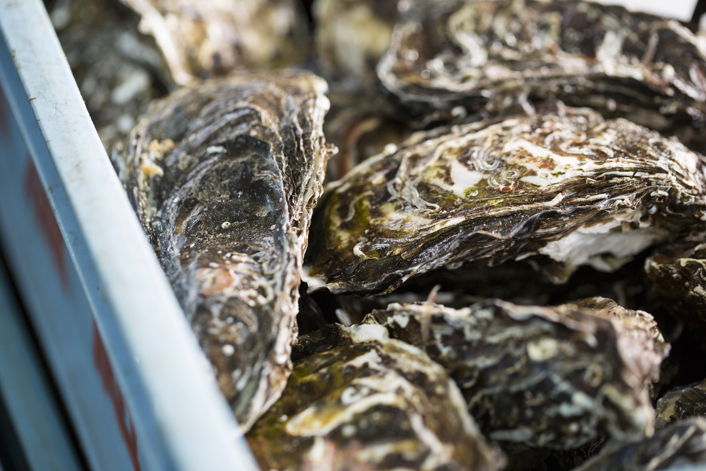 餌となるプランクトンを牡蠣に独占させるため、塊を一個一個ばらし、雑物の海藻やムール貝を取り除き(ムール貝は真水では死なないので全部手作業で除去してます。)、真水にしずめる。そして、また海に戻す。間引きしてまとめて水揚げされたカキをひとつひとつ丁寧に分ける事で殻の育成を止めて栄養がすべて身の方に行くように殻に栄養がいかないようにして育てています。この手間をかけた工程が良質な牡蠣を作る秘訣です。