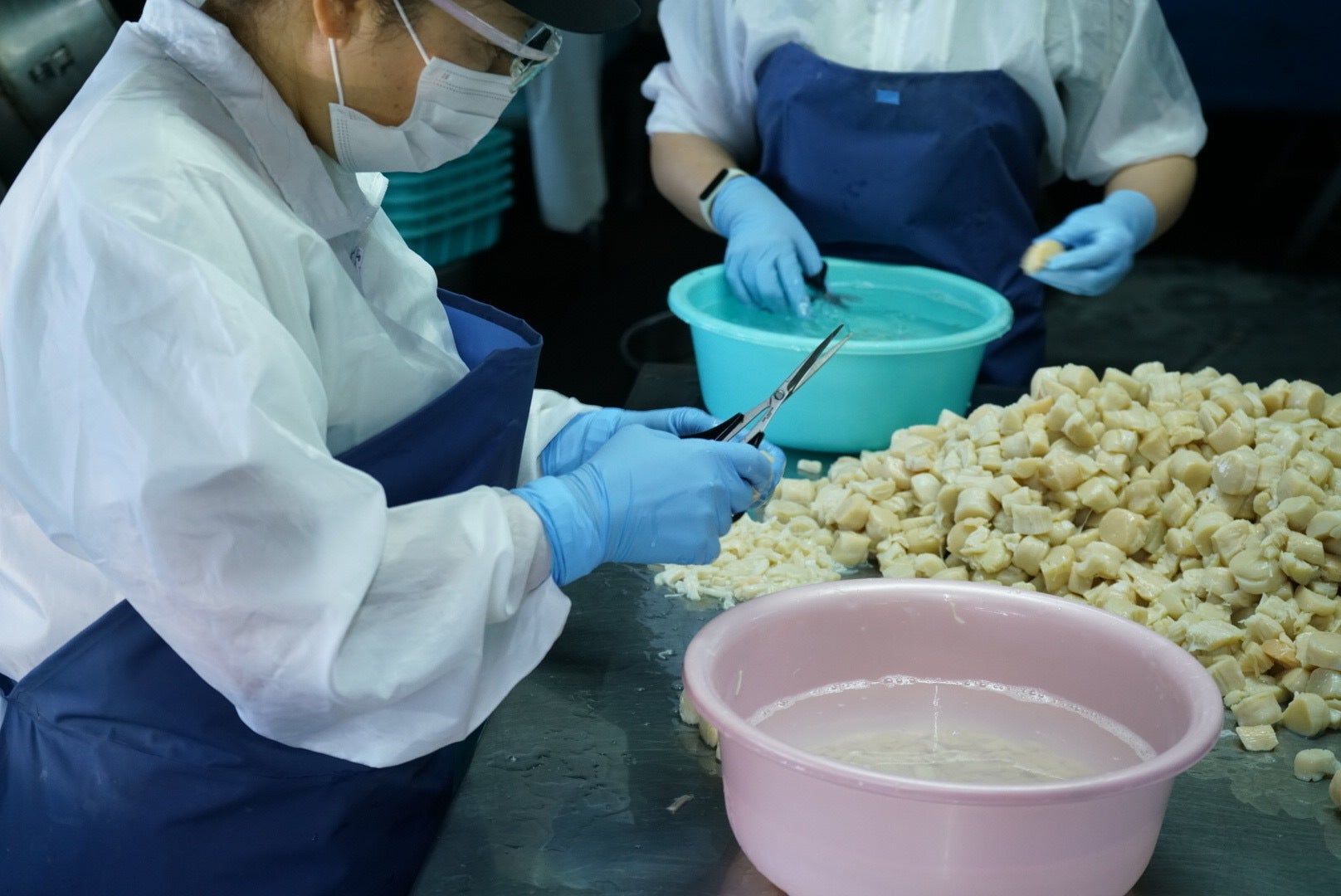 機械化できない工程が多いため手作業でホタテの貝柱やヒモを剝き、味つけして、焼くなどの一連の作業を行います。
