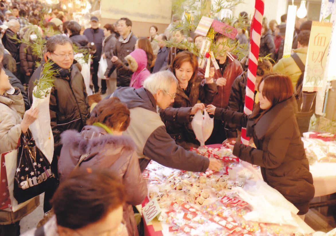 大阪には今宮戎神社(大阪市浪速区)があり、商売の神様である戎さまが祭られています。例年1月9~11日には十日戎という行事があり、3日間で100万人を超える参詣者があります。「福娘」から「福笹」をもらい、「吉兆」の飾りをつけた福笹を持ち帰るというものです。境内周辺には多くの露店が立ち並び、大勢のお客さんで溢れます。
