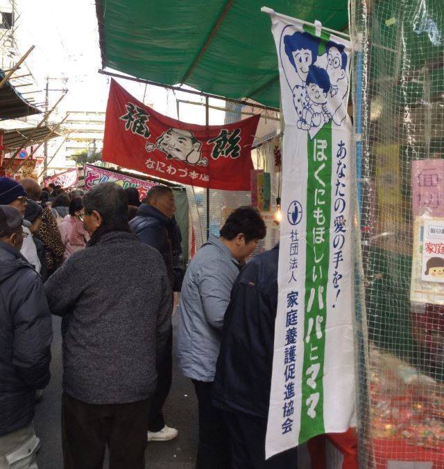 わたしたちも、一般の露店に混じって出店し、お多福さまの顔を描いた「福飴」を売り、活動資金の一部にあてています。飴を購入してくれた人にチラシを配り、広報活動をしています。福飴売りは、資金獲得や広報の活動としても、とても大切な活動です。