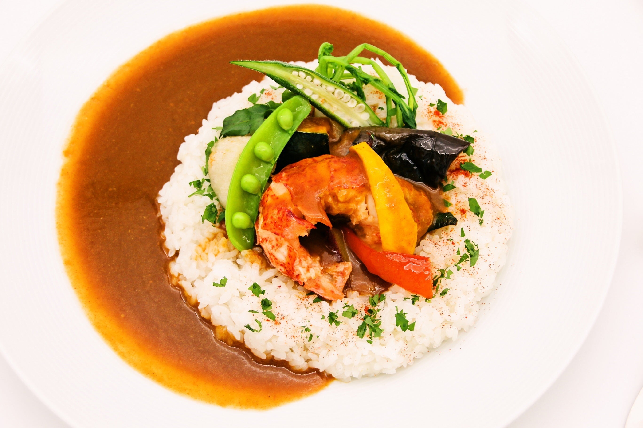 活きのオマール海老の頭やミソだけでなく身もソースに使い濃厚な旨味を出し、香味野菜の香りや自家製スパイスで味を調えた特別なカレーです。