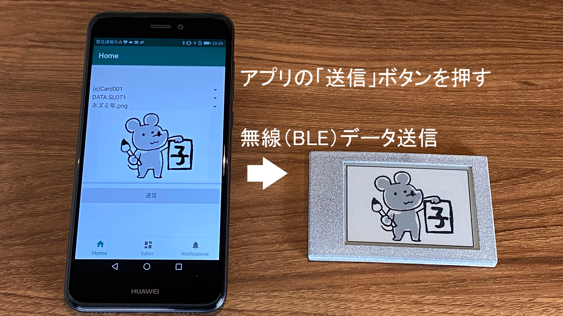 スマホアプリの「送信」ボタンを押すと、無線(BLE)でイメージデータが(e)CARDへ転送されます。転送時間は端末によって差がありますが、早い端末なら数秒で完了します。