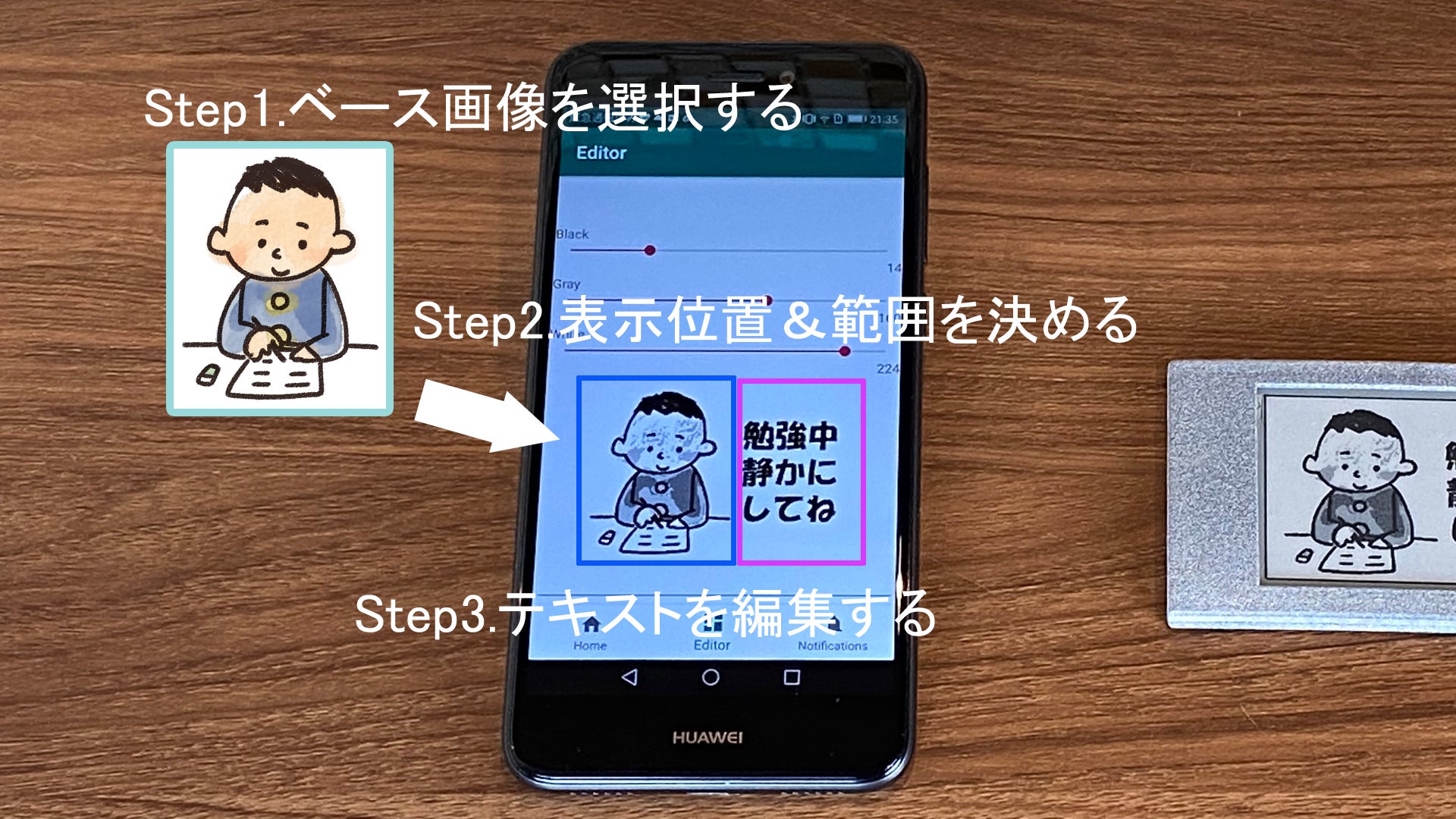 画像はカメラで撮った写真でも、Webからダウンロードしたイラストでも構いません。テキストだけを表示した場合は、この作業は不要です。