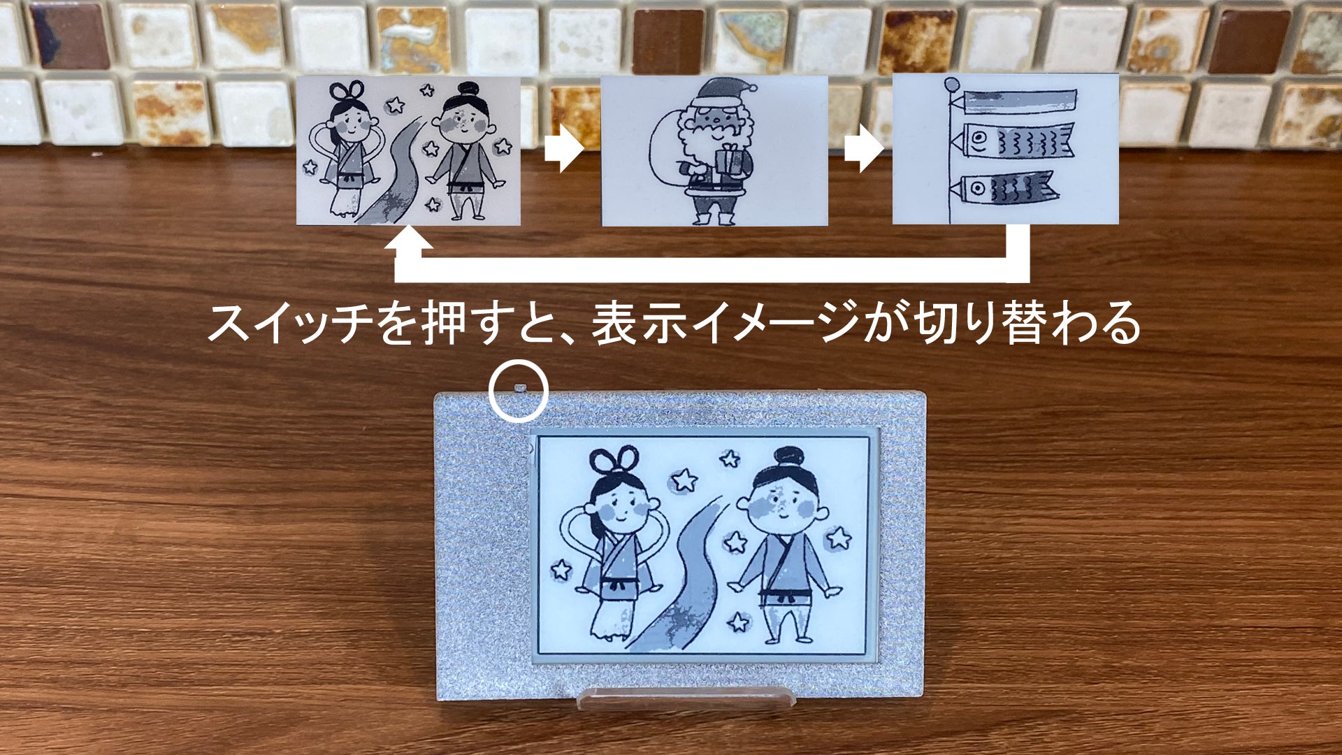押しボタンスイッチを押すとイメージが切り替わります。イメージは最大5つ記録する事ができます。3つイメージを記録している状態では、1->2->3->1と順番に切り替わります。