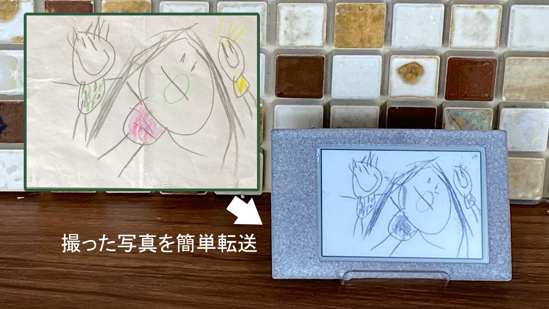 普段の生活で起こった「ちょっとした面白い事」が家族のコミュニケーションのきっかけになったら、生活はもっと楽しくなると思うんです。子供が描いたおかしな絵をすぐにカメラで撮って「(e) CARD」に表示しておく。それを見た人が「何これ?」から会話が始まる。些細な事でも、それがきっかけで笑顔がうまれたら嬉しいです。