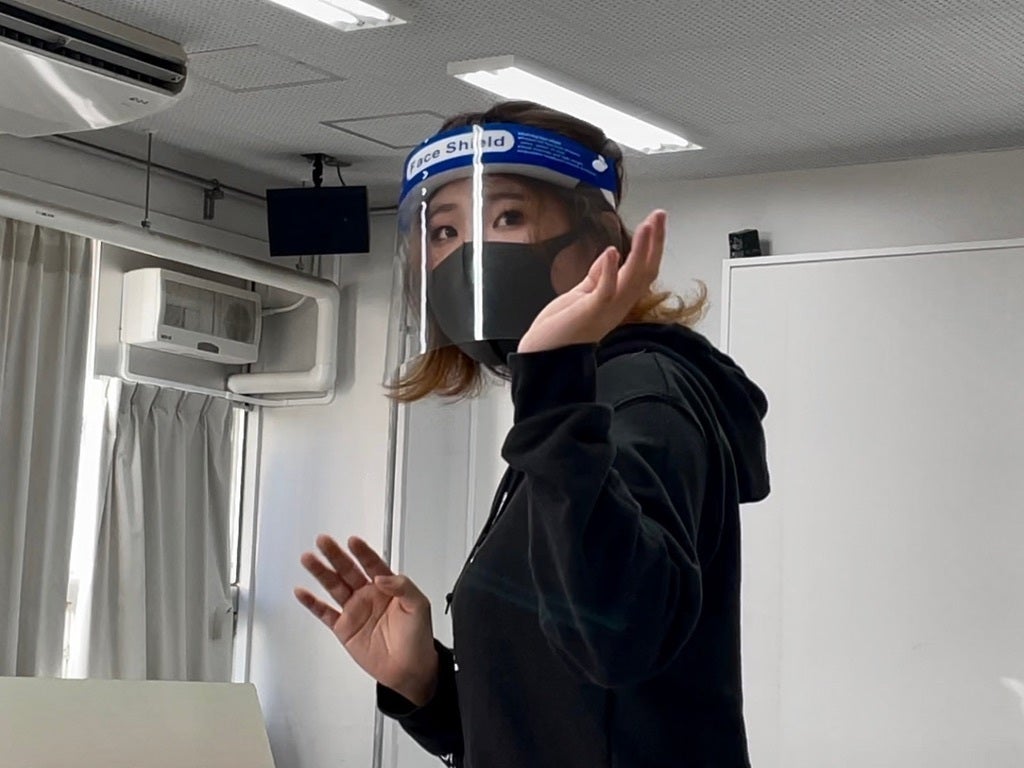 感染症対策のため、キャストは常にマスクとフェイスシールドを着用しています。