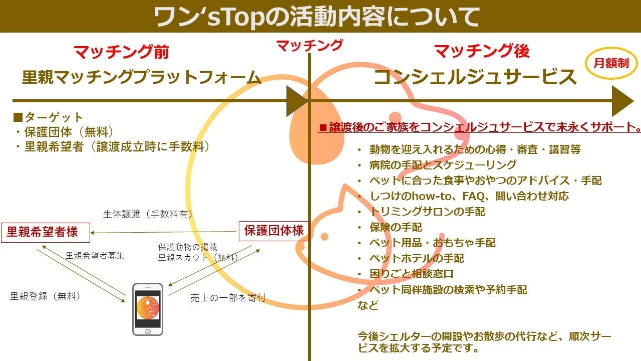 「保護犬や保護猫の幸せな生涯」×「保護動物達を幸せにしてくれる人」を「能動的」にマッチングさせることの事業化です。