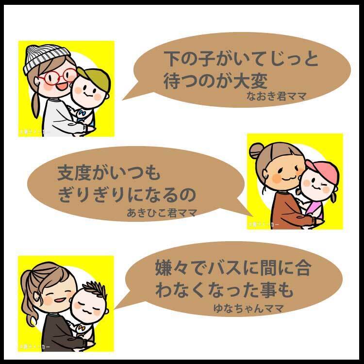 皆も私と同じように、バスは楽だけど、小さい子をじっと道路で待たせるのは結構大変と感じているんだなと思いました。
