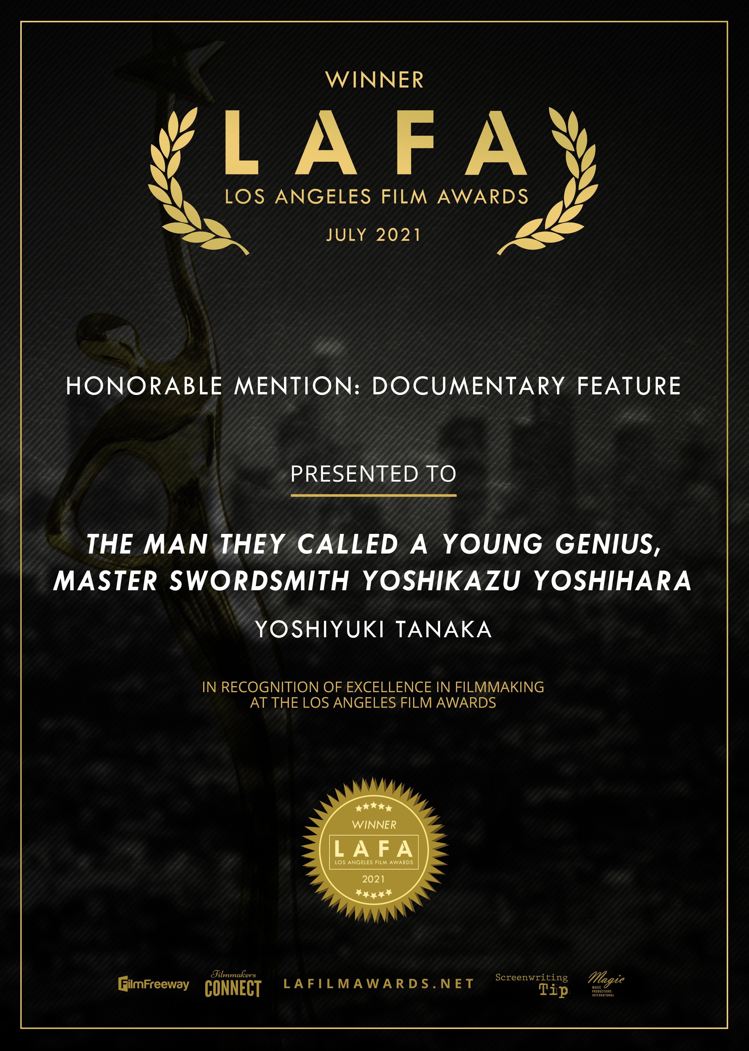 日本時間の今朝、LosAngels Film Awardsの授賞式で、なんと!特別賞をいただけました!!